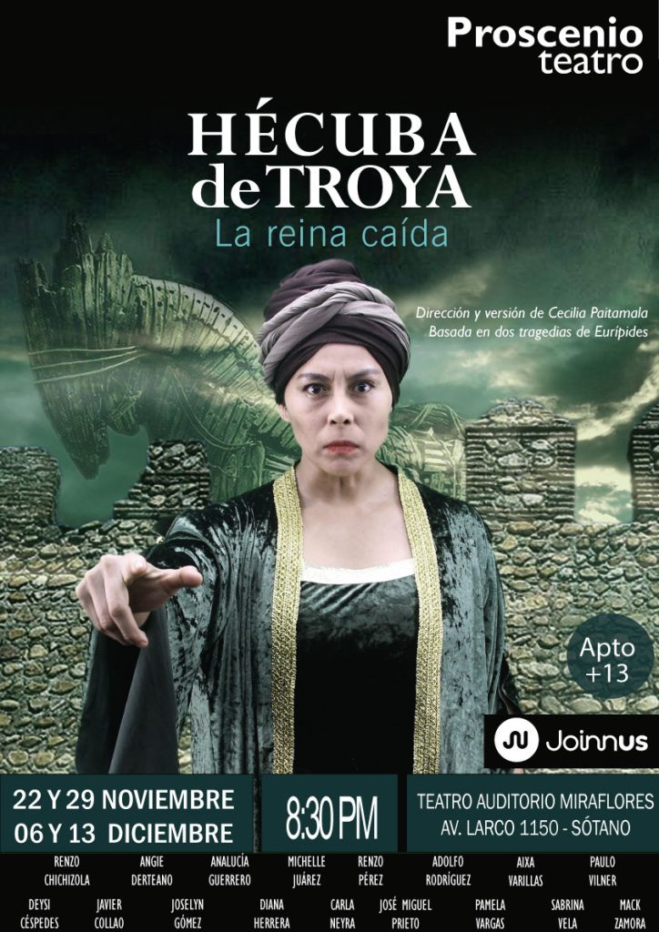Un gran elenco de 17 actores profesionales, dan vida a esta dramática obra, producida por Proscenio Teatro y dirigida por Cecilia Paitamala quien ha creado esta nueva versión partiendo de las obras Las Troyanas y Hécuba del dramaturgo griego Eurípides.